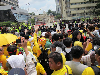 The atmosphere was much more fiesta-like than last year. There were people in yellow t-shirts or in other colours, in shorts or in tudungs, lots of young ones and some also of a certain age. Like last year, it was a very diverse crowd. I bumped into some old friends, some young people I knew including a nephew and the children of some friends, and met some new ones, people who were coming to a rally for the first time ever. These were not radical highly-politicised types, just your average men and women, the type you'd meet at the supermarket perhaps. I asked one newbie woman why she came and she said it was because she realised that if she wanted change, then she had to do something.