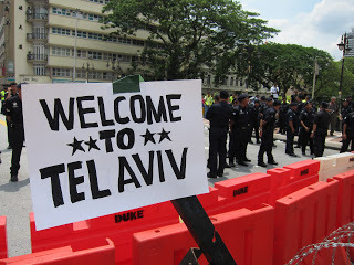 View of Lebuh Pasar Besar towards Dataran Merdeka. We are behind the barriers and the cops are beyond.I got to the front of the barrier where someone had put up a sign that said 'Welcome to Tel Aviv'. It felt very accurate. The police recognised me and nodded. I asked them, "What is this?" pointing at the razor wire, which has blades on them which can seriously cut you if you get hurled on to them (see close-up pic above). The senior cop there shrugged and gave a wan smile. "This makes me sad," I said to him. Again he shrugged.