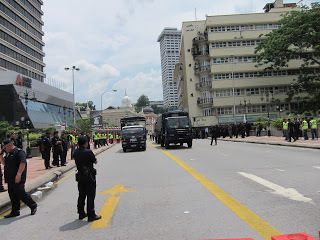 When we got to Lebuh Pasar Besar, there was a big crowd on it facing the direction of Dataran Merdeka while others continued on to Jalan Tun Perak. We decided we would stay on Lebuh Pasar Besar (where the Bar Council is) and made our way towards the bridge across the Klang River (just before Agro Bank). That was where we had to stop because the police had put up a barrier of barbed wire (actually my husband said it's razor wire, not barbed wire) and those red plastic road barriers, all stamped 'DUKE'. On the other side of the barrier stood a whole row of police. Most look quite senior and they simply stood there and looked at us.