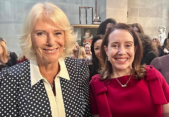 Julia Quinn was a guest of HM Queen Camilla at The Queen’s Reading Room Festival at Chatsworth House. This exciting event, held last month at the stately home known to the world as Pemberley from 2005’s Pride & Prejudice movie starring Keira Knightley and Matthew MacFadyen, featured such luminaries as Jojo Moyes, Helen Fielding, and the late Dame Jilly Cooper. JQ was honored to speak with Dame Jilly at dinner, telling her about her first experience with her books (Riders) while at boarding school in Gloucestershire.
