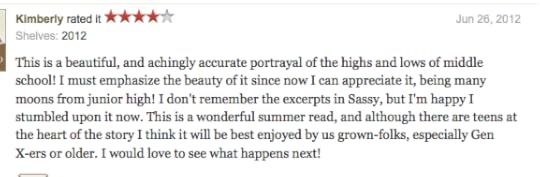 Kimberly on Goodreads wrote: “This is a beautiful, and achingly accurate portrayal of the highs and lows of middle school! I must emphasize the beauty of it since now I can appreciate it, being many moons from junior high! I don’t remember the excerpts in Sassy, but I’m happy I stumbled upon it now. This is a wonderful summer read, and although there are teens at the heart of the story I think it will be best enjoyed by us grown-folks, especially Gen X-ers or older. I would love to see what happens next!”