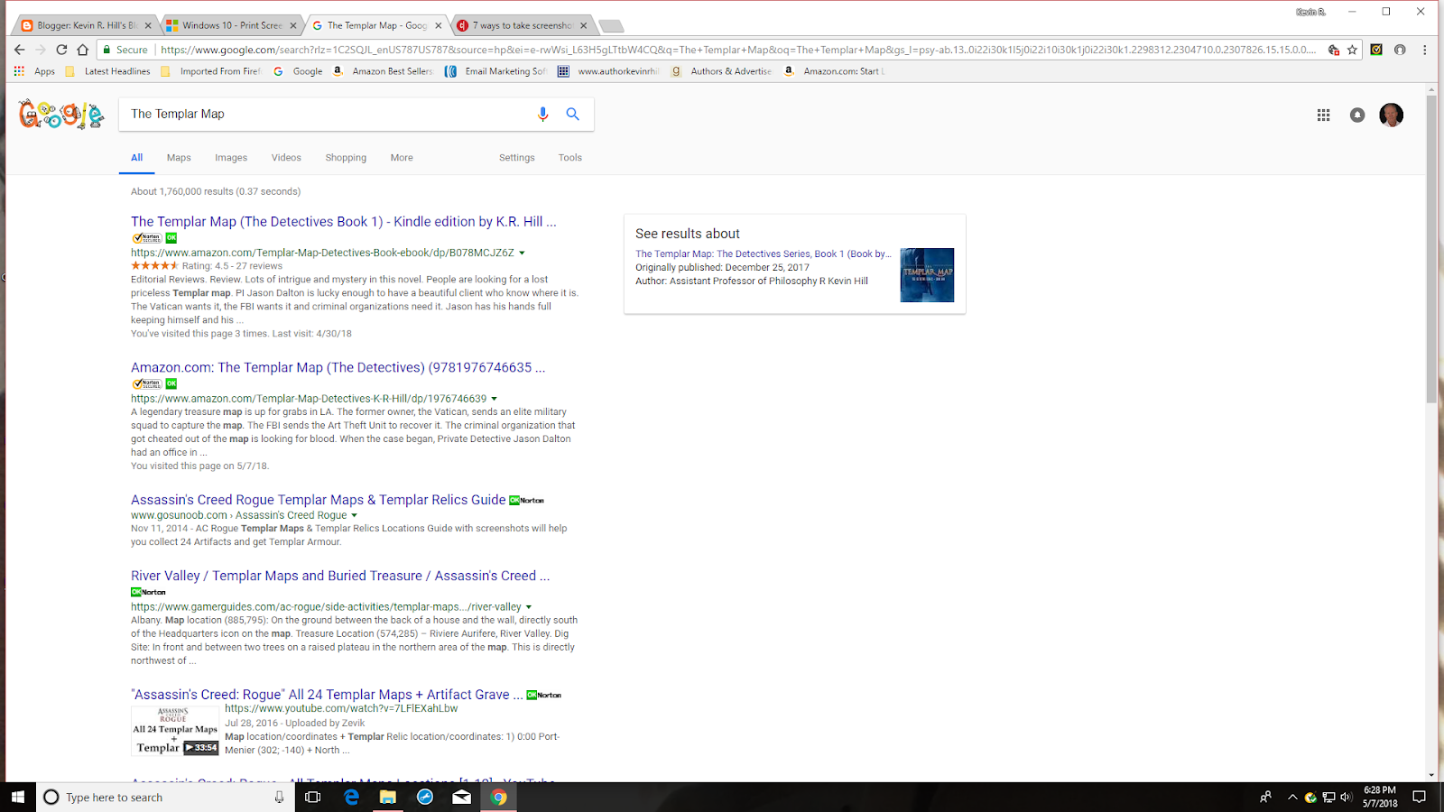 Author K.R.Hill Google made a blunder. I have asked them to remedy it, but asking Google to change something is akin to petitioning the moon.If you google my book title, The Templar Map, you'll see that Google lists R.Kevin Hill, assistant professor of philosophy, as the author. "Ah, google, are you there?"
