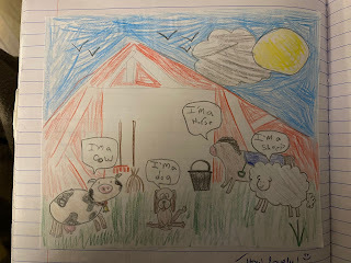 El otro día mi hermana me mostró unos dibujos de animales que había hecho mi sobrina y me dio mucha gracia ver que al perro lo había hecho siguiendo este cuentito, que se lo enseñé hace unos meses.