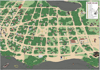 En marzo me convocaron del Instituto de Letras de la Dirección de Cultura del MEC para hacer una ilustración que vestiría el stand de Uruguay en la Feria Internacional del Libro de Buenos Aires.El tema del stand era Cartografías de ficción. Partieron del mapa que hizo Onetti de Santa María, la ciudad de sus novelas, y quisieron hacerlo dialogar con las cartografías de dos novelas de autores contemporáneos.A mí me propusieron crear el mapa de Paso Chico, el pueblo en el que transcurre la novela Carnada, de Eugenia Ladra.El resultado fue un mapa del estilo del Mapa Social de Trinidad que hice hace unos de años, pero con mucha más carga narrativa.