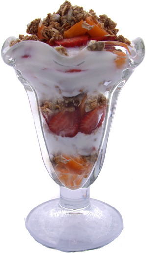 Take a cup of plain low-fat yogurt, add a few drops of vanilla and a little sugar or honey if desired. Mix well. Top or layer with fruit, chopped or sliced nuts, grated coconut, and granola or whole grain breakfast cereal.