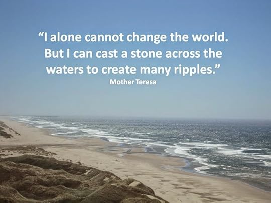 First and foremost is my grandfather. He had the kindest and most compassionate heart of any human being I have ever met. I love Maya Angelo for her courage and inspiration. Dr. Eichler, my humanities instructor in college for teaching me that dates mean little in history, it is only through learning how one event leads to the next that we will be able to improve our lives and avoid making the same mistakes. I also adored Mother Teresa, “Not all of us can do great things. But we can do small things with great love.” And, “I alone cannot change the world. But I can cast a stone across the waters to create many ripples.”