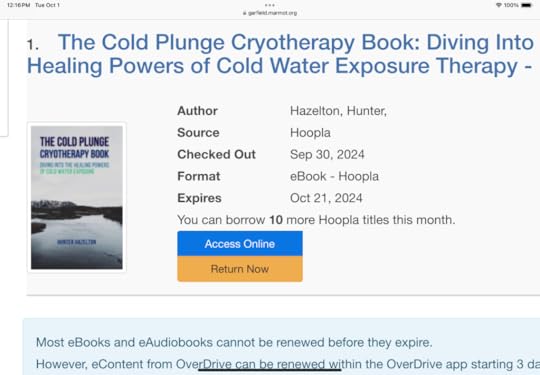 Just two days into my second week of consistent cold plunging and I am a believer. Aside from the information on the placard photographed in the previous post, I felt a need to do a bit more research regarding the benefits of the Cold Plunge (Cryotherapy). I found this eBook at the library: