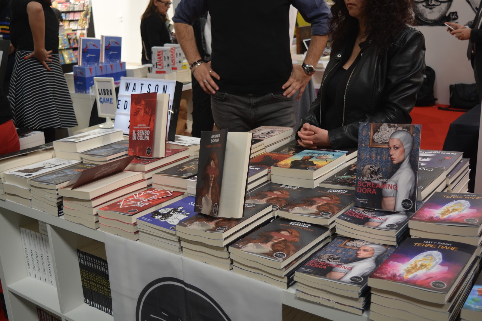 Il primo, senza dubbio, è Watson Edizioni, che ormai è una grande famiglia. Allo stand sono state presentate varie novità di fantascienza: il cyberpunk “Skin” di Delos Veronesi (seguito di Winter, davvero raro esempio di cyberpunk in Italia), la distopia “Screaming Dora” di Laura Scaramozzino (che è una donna entusiasta e infaticabile, dato che ha fatto 5 giorni in piedi a vendere), la fantascienza speculativa di Matt Briar “Terre rare” (premio Kipple), e “L’ultimo viaggio della Dnepro” di Alessandra Cristallini e Andrea Pomes (finalisti premio Urania).Inoltre, Antonio Schiena ha presentato il suo ultimo romanzo, “Andrà tutto bene”. Sembra un’inversione di tendenza rispetto al suo titolo precedente, “Non contate su di me”, ma Antonio ha assicurato che questo nuovo romanzo è assolutamente coerente con la sua personalità.Ci sono poi “Le Mezzelane”, che essendo una casa editrice marchigiana quest’anno era alloggiata presso lo stand della regione ospite, le Marche, per l’appunto.“Le Mezzelane” sono un editore gestito con tanta passione da donne, che produce romanzi di altissima qualità, forse tra i migliori di quelli degli editori indipendenti per la cura che ci viene messa.