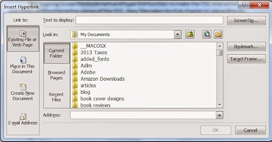 Step 3—HyperlinksReturn to your TOC page and select the first item. In the example above, the item is Prologue. Now return to the Insert tab and select the Hyperlink icon. This opens the hyperlink dialogue box.