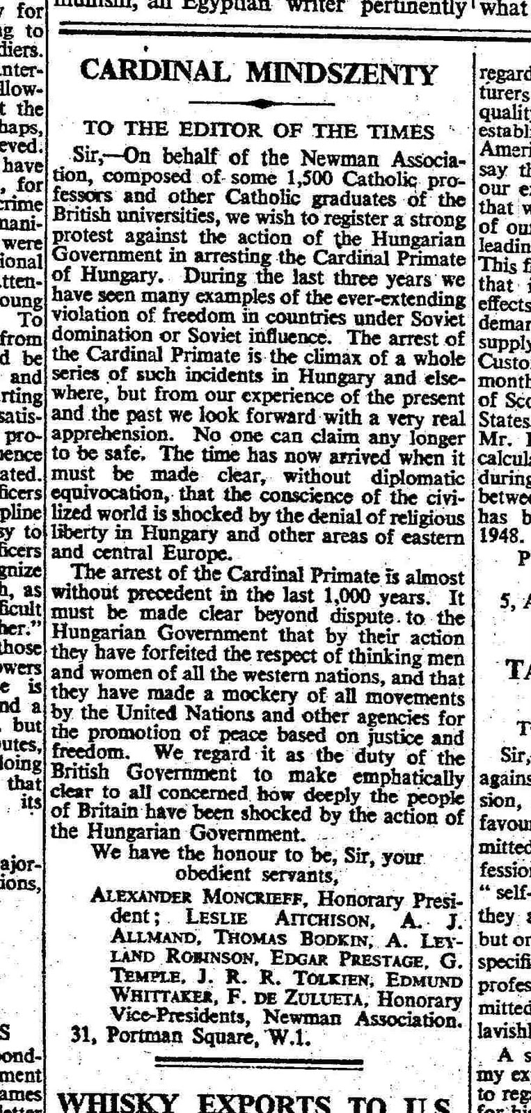 Oltre al legame con padre Morgan e l’Oratorio San Filippo Neri a Birmingham fondato dallo stesso cardinale Newman, c’è da ricordare che Tolkien fu membro attivo anche della Newman Association , nata nel 1942, e registrata cinque anni dopo, con l’intento di riunire i laureati cattolici e approfondire i temi della fede cristiana. Il sodalizio cattolico s’ispira sin dalla sua fondazione al Cardinale che voleva “un laicato non arrogante, non precipitoso nei discorsi, non polemico, ma uomini che conoscono la propria religione, che in essa vi entrino, che sappiano bene dove si ergono, che sanno cosa credono e cosa non credono, che conoscono il proprio credo così bene da dare conto di esso, che conoscono così bene la storia da poterlo difendere” (The Present Position of Catholics in England, IX, 390). Ed è proprio questa sua esperienza associativa a rappresentare l’anello di contatto con il futuro venerabile Mindszenty e nello specifico, il momento dell’ingiusta incarcerazione dell’allora cardinale per mano del regime comunista ungherese.Come si è scritto, infatti, l’arresto del cardinale Mindszenty nel 1948 provocò fortissime reazioni nell’ambiente cattolico in tutto il mondo e diversi furono gli appelli in favore della sua scarcerazione. Nel Regno Unito si schierò la Newman Association di cui faceva parte Tolkien, che redasse un appello pubblico a favore della scarcerazione del cardinale Mindszenty inviato al The Times affinché lo rendesse pubblico. Il testo è stato ritrovato nel 2011 da Douglas A. Anderson che lo pubblicò sul suo blog.