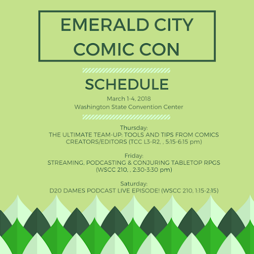 Here's my updated +Emerald City Comic Con delegate schedule. I'll be talking about comics, podcasting, and more. You can also catch the rest of the d20 Dames at other panels throughout the weekend: https://d20dames.com/events/