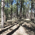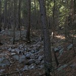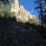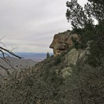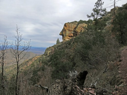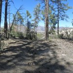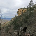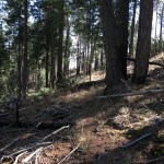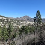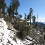 As expected, the plateau, with its parklike ponderosa pine forest, is exposed enough to be snow-free by now. But it’s also windy enough to get constant blowdown. Despite a little annual overgrowth that obscured the already faint tread in many places, I remembered it well and was able to reach the west end, where the trail drops precipitously toward the next saddle.