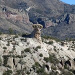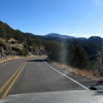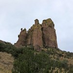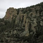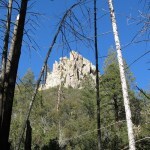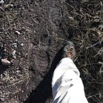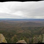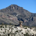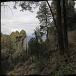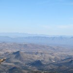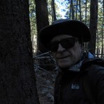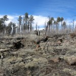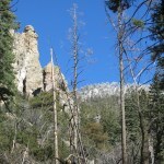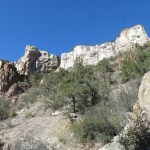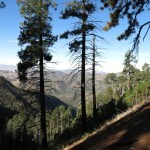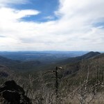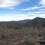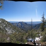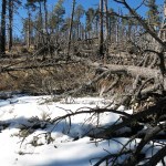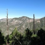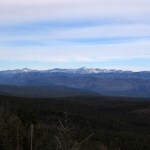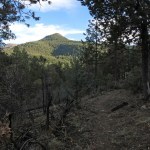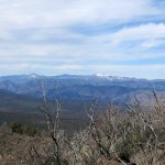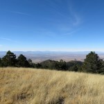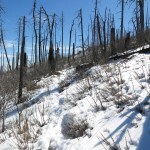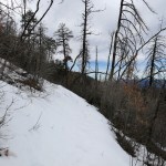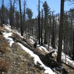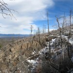 When I reached the crossover to the shadier east side of the crest, the patches of snow became deeper, and I strapped on the gaiters and broke out the trekking poles, hoping they would improve my balance as I lurched across the sometimes frozen, sometimes soft snow between deep holes punched by Bigfoot. The view from the east side – across rocky foothills and the Rio Grande Valley to 12,000 foot Sierra Blanca Peak over a hundred miles away in the Sacramento Mountains – would be spectacular except for the skeletons of pines and firs killed by the 2013 wildfire.