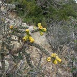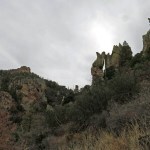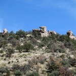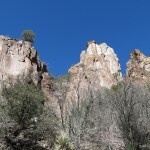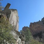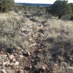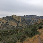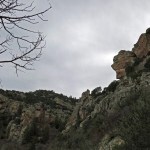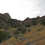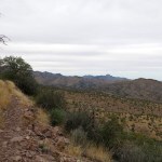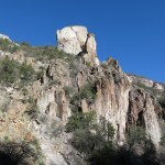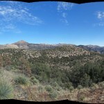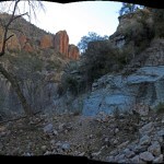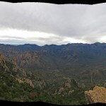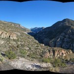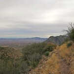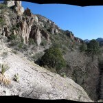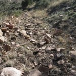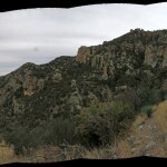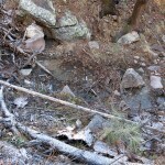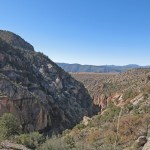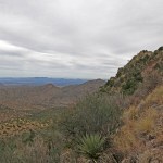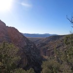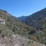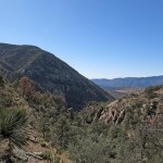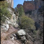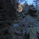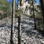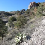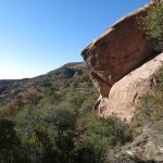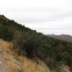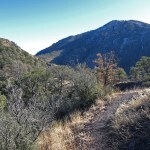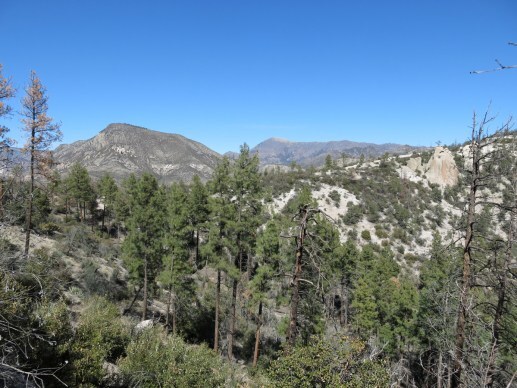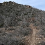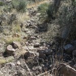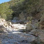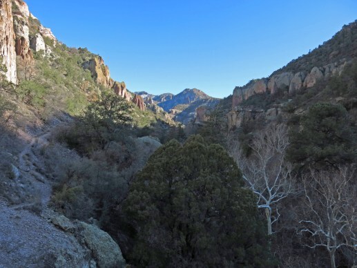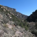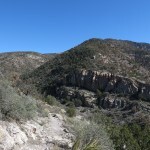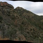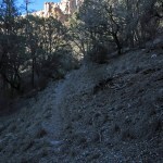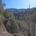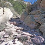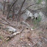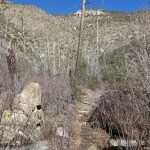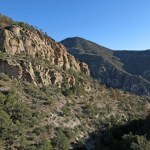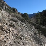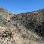 At the head of the valley you pass over a scenic rock dam and begin the first set of switchbacks, which seems endless. My foot seemed to be doing okay here. The switchbacks were decorated with frequent pink ribbons, which I assumed had been left recently by the Backcountry Horsemen, who have the permit for trail work. Their horses had left plenty of shit on the trail, probably from last fall, but I couldn’t figure out what the ribbons were for – they seemed completely random. As far as I’m concerned the trail needs no more work than they’d already done years ago, but the equestrians love to cut trees, cacti, agave, yuccas and nolinas way back from the trail. I even found spots where they’d hacked manzanita as much as eight feet off-trail.