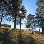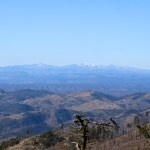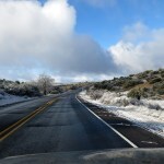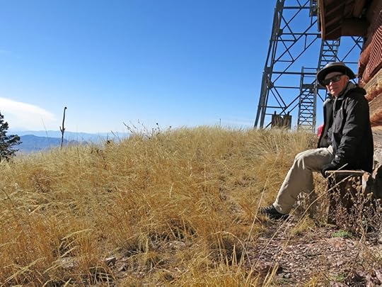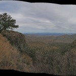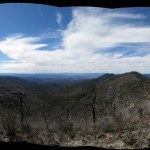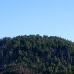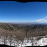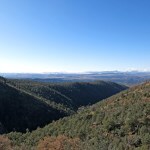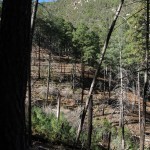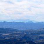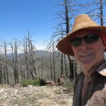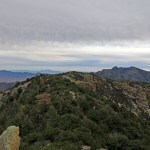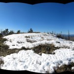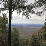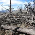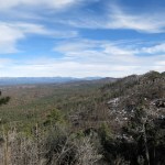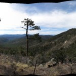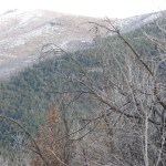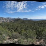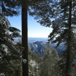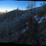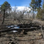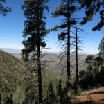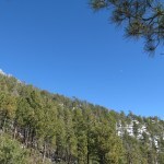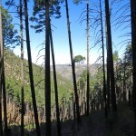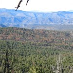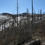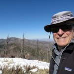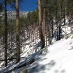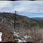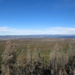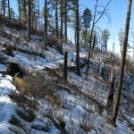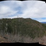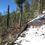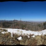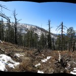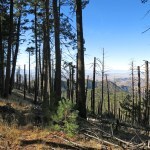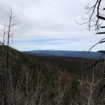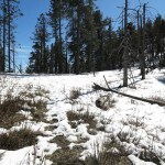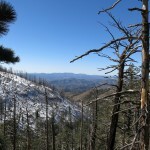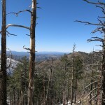 Sure enough, much of the snow on the north slope had melted by my afternoon return, so that although it was easier going downhill, it was almost as slow as the morning’s ascent. The sun did come out, enhancing the view and the contrast of drought-killed vs intact pines in the forest below.