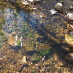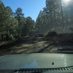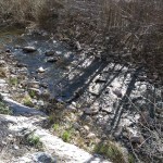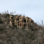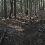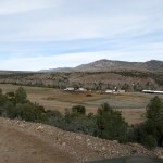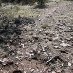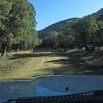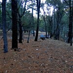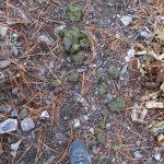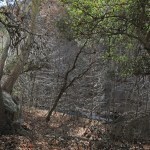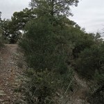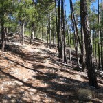 Nearing the pine park, which is a level plateau, I came upon a guy with an off-leash dog – a violation of forest regs. I started bitching to him about the cattle, and he said he’d seen a “whole bunch” up on the plateau, around a pond that was holding water now. I assumed by a “whole bunch” he meant at least 8-12, and was even more surprised. I wondered if these cattle had drifted over through a gate left open by ignorant hikers, then become trapped over here behind the fence.
