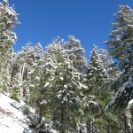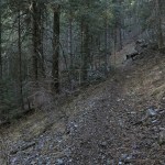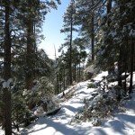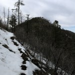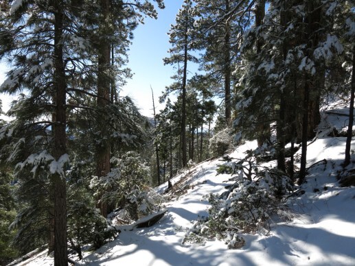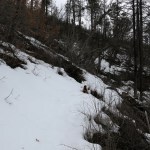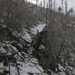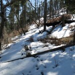 At a saddle just below the peak, the trail crosses to the east side again, but here, Bigfoot continued straight up the steep slope. I’d done that before, there was no way I was going to try it in snow that was now over a foot deep. So I followed what I thought was the trail, beckoned by the tracks of a lone deer. I was halfway across the traverse to the next saddle when I realized the deer had led me off the actual trail, and I would now have to pick my way through deadfall to the back side of the peak, where the slope is gentler.