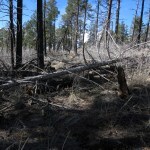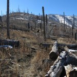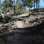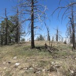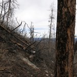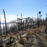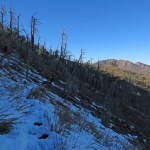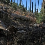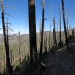I finally found myself above the little saddle on the south side of the peak, where I normally start my bushwhack upwards. Although the south slope is gentler, it was burned in the fire and is becoming crisscrossed with more and more deadfall every year as giant pine and fir snags continue to topple.