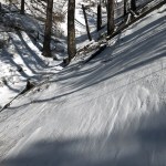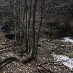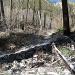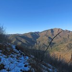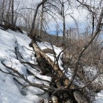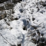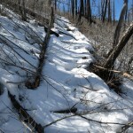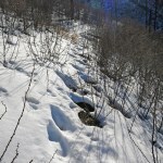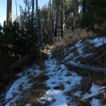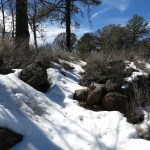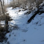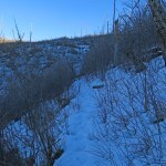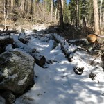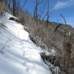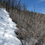 I was prepared for snow and should’ve expected it on that steep north slope, but I’d really hoped for an easier hike than last Sunday. When I did reach the first snow after the initial climb to ridge top, it was only a couple inches deep and had been tracked by a small woman and her huge dog since our last storm, a few days ago.