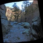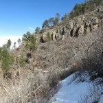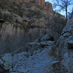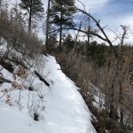 Sadly, I was wrong. Like many trails in the Southwest, this is routed mostly on north and east slopes to reduce solar heating, and most of the trail was snow-covered, up to 16 inches deep. And making it much worse, someone or something had walked the trail shortly after the last big storm, punching deep holes at intervals longer than my own footsteps. And adding insult to that injury, the snow had then melted and frozen repeatedly. Each step I took would either land on rigid snow, or snow that would compress a few inches, or snow that would collapse a foot or more, and there was no way to anticipate without taking the step. In the process, my foot might sink directly down, or slide forwards, backwards, or sideways, and sometimes end up tilted, throwing me further off balance.
