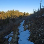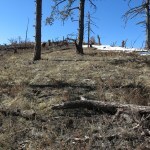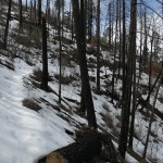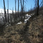 The sky was mostly clear, and the high in town was forecast to reach the mid-60s. So despite the high elevation – this hike climbs a peak, from 8,200 to 9,700 feet – I expected most of the snow we’d had weeks ago to be melted by now, especially in the exposed ground of a burn scar. I carried my gaiters and trekking poles but didn’t expect much trouble.