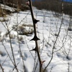 Of course, going the distance meant I’d have to repeat that struggle with snow postholed by Bigfoot on the way down. I kept using the trekking poles, although it was a toss-up whether they helped or hindered, because they had the same problem as my boots – either hitting rigid snow, or sinking part or all the way. And when they sank all the way into the snow, they often snagged and yanked me further off balance. And they constantly got caught in the thorny locust that leaned over most parts of the trail.