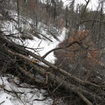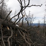 The next complication I should’ve anticipated was the deadfall. This long after the fire, dead trees of all sizes were constantly falling across the trail, many with their branches intact.