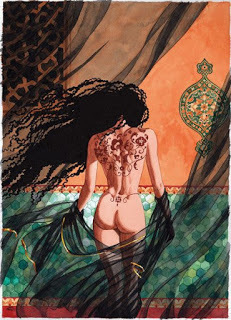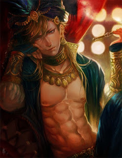 Stepping inside the warm ring of light cast by the camp fire, the stranger over his shoulder stirs. Sadiq slows, laying him down carefully to his pad of blankets. With darkly lidded eyes, the young man looks around with confusion, and subtle relief. Questions seem to collect upon his brow, but he does not ask them. After a few moments, he meets Sadiq’s intense gaze.“You should not have brought me here.”Sadiq is a little put off. He kneels down before him. “Who are you?”For several breaths, the man stares at Sadiq with tired eyes.“Takrim. My name is Takrim.”“I am Sadiq.” They nod in greeting, but Takrim’s movements are hesitant. “What happened to you? Was something following you?” Takrim stares out into the darkness beyond the light of the fire.“It does not matter.”He pushes his arm into the ground in order to stand.“I must leave.”Sadiq places a hand on his shoulder, firm.“You are in no condition to travel.”Takrim deeply fills his chest. “My life is none of your concern.”Sadiq smiles, giving his shoulder a paternal pat. “It is now, stranger. My conscience will not allow me to shoo you off, half starved, thirsty, and with nothing to protect you from the chill. When is the last time you ate or drank?”Takrim raises his hand to his face, weary. Seeing he will not – or cannot – answer, Sadiq reaches for his leather waterskin. “Here, it’s water. Better have your fill.”“No.”Takrim pushes away the waterskin and again tries to stand.“Easy, stranger.”Sadiq grasps his bicep, holding him. They lock gazes.“You are safe now. I don’t know what you’ve been through, but you don’t have to be afraid. Please... let me help you.”Sadiq offers the waterskin again. Takrim accepts it. His eyes glaze as he lifts it to his lips. Swallowing a small sip, he begins to tremble. Sadiq catches the waterskin before he drops it. “I must... leave...” Takrim gasps. He shakes so bad he can barely get his arms underneath himself. Sadiq covers him with a thick fur. He puts pressure on his chest, forcing him to lay back.“No... I cannot... stay here. The ghylan... are coming.”“Ghylan?” Sadiq huffs, reaching for his pack. “I think you need something a bit stronger than water.”“The ghylan!” Takrim writhes. Sadiq sits behind Takrim and pulls him against his chest, one arm restraining him, one arm holding a metal flask.Takrim tries to resist, but he does not have the strength to fight. “Easy, stranger. You’re safe now.”Sadiq waits until his thrashing calms, then shows him the flask.“Red grape wine from Ksara.”