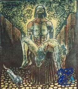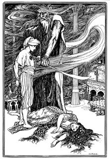 Helen, being held by a dark eyed, dark haired stranger, can only watch.