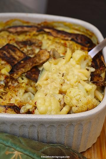 METHODBoil or steam your cauliflower florets and set aside. Don’t leave them covered once cooked and tender, and don’t overcook them to the point of almost melting, tender will do.Boil your pasta until al dente, drain and rinse with cold water to stop the cooking process from continuing, and set aside.Grease a large, deep enough dish in readiness for assembling the recipe. The one I used was around 10 inches in diameter and 3 inches deep.Sauté your zucchini until golden on both sides and set aside. Then do the same with the mushrooms.Place your cheese, plant-based milk, nutritional yeast, tapioca starch, turmeric, salt and garlic in a high speed food blender/liquidizer (I used my Vitamix) – and blend until smooth. Then pour into a large non-stick saucepan, and heat up stirring almost constantly until it thickens. Set aside as is for a few moments.Place your cauliflower in the cheese sauce mix and gently make sure that all the pieces are immersed in the cheese.Then add your pre-cooked pasta and pre-cooked mushrooms and do the same.Gently spoon the mixture into your pre-greased oven dish, and carefully place your pre-cooked zucchini pieces on top around the edges, and make a cross in the middle for decoration if you wish.Sprinkle on the chilli flakes, and bake in your pre-heated oven until golden on top.Remove from the oven once golden, and allow to rest for 10 minutes before cutting out the portions and serving. Enjoy !The post Cauliflower Mushroom Mac and Cheese appeared first on Mouthwatering Vegan.