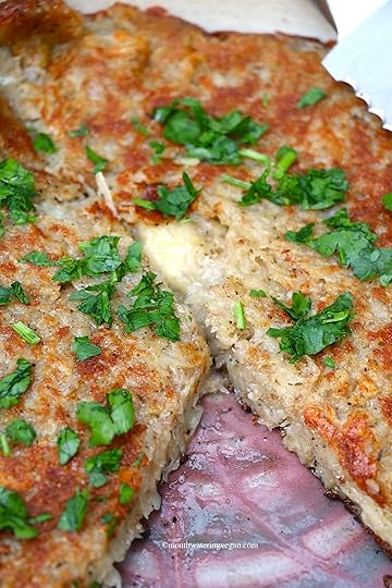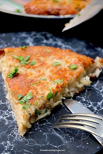 First, grease an oven dish.Then cut your cooked potatoes into approx ¼ inch slices (yes, in their skins), and spread them evenly across the base of the dish.Apply the next layer in the same way, and go make your cheese sauce.Place your nuts and water in a high speed blender, and process until smooth.Then add 1 cup of the cheese (leave the other half cup for garnishing), the tapioca starch, nutritional yeast, garlic cloves and vegan butter and process until smooth. Add half the parsley, and process only for a few seconds so that it appears finely chopped in the mixture.Pour the mixture (it should be a little thick) over the potatoes, garnish with the remaining vegan cheese, half of the remaining parsley, and place in a pre-heated oven at 200°C/390°F for half an hour.Allow your gratin to become golden brown, and then garnish with parsley and a drizzle or two of olive oil.Serve & Enjoy !NOTE : – If it dries up a little too much for your liking, pierce some holes with a sharp knife, and add some unsweetened plant based milk.