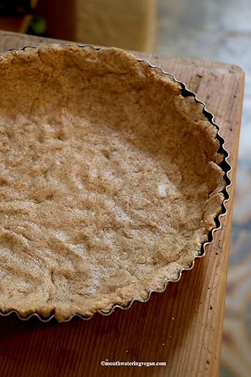 5. With clean hands, remove the ball and press it onto the baking quiche tray, distributing it as evenly as you can. Take care at the edges, and be sure to press down to form a nice, even base. Set aside to make the filling.