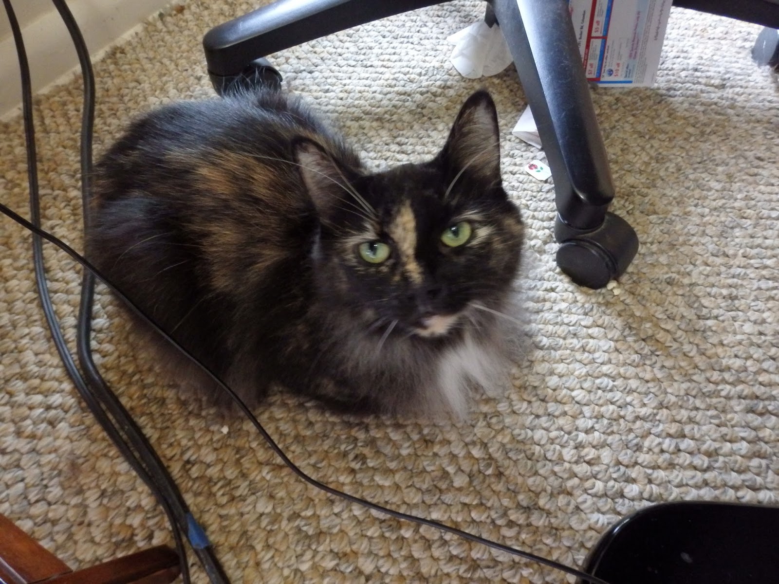 She is always running and jumping. She zips from the bedroom upstairs down to the kitchen and then jumps up onto a seven-foot high bookcase. She'll do this all day, late into the night. The patter of her little feet are a constant in the house. And she talks. She talks all day long. I have no idea what she thinks she has to talk about.