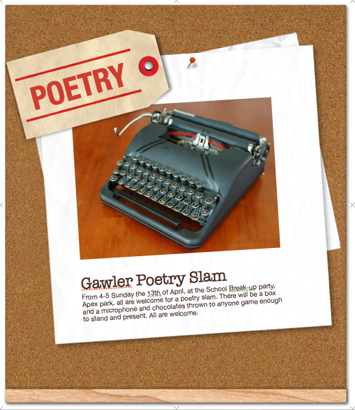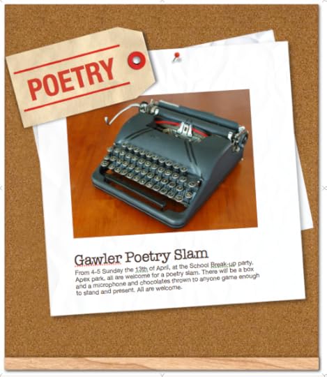 I had been worried about people being unable to find the cafe, that seems to be the common drawback for nifty cafes, they tuck away too well. A few people did arrive late, but we got them up to speed, sharing what we had done so far and asking their opinions. Seven people, including myself arrived, just enough so, thus far, I have not forgotten anyone's name. The cafe was wonderful, we had a fabulous room to ourselves with vintage designs and wooden tables - a perfect writers' hub. We then went over time just talking, so all together, I think we did well. This week we'll all try to compose our own spoken poem, and I can't wait to see what everyone comes up with. Our local paper, thus far, has done a story, which again may attract new members, and soon I might put some photos on this blog.