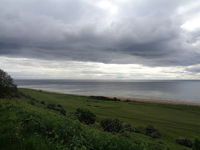 The view from the village across the golf course to the beach.We hadn't been walking long when the gray clouds started to look distinctly more threatening.
