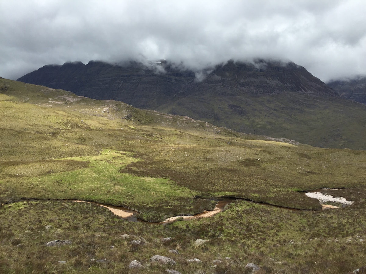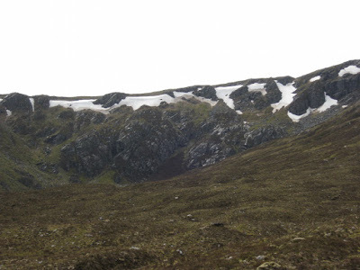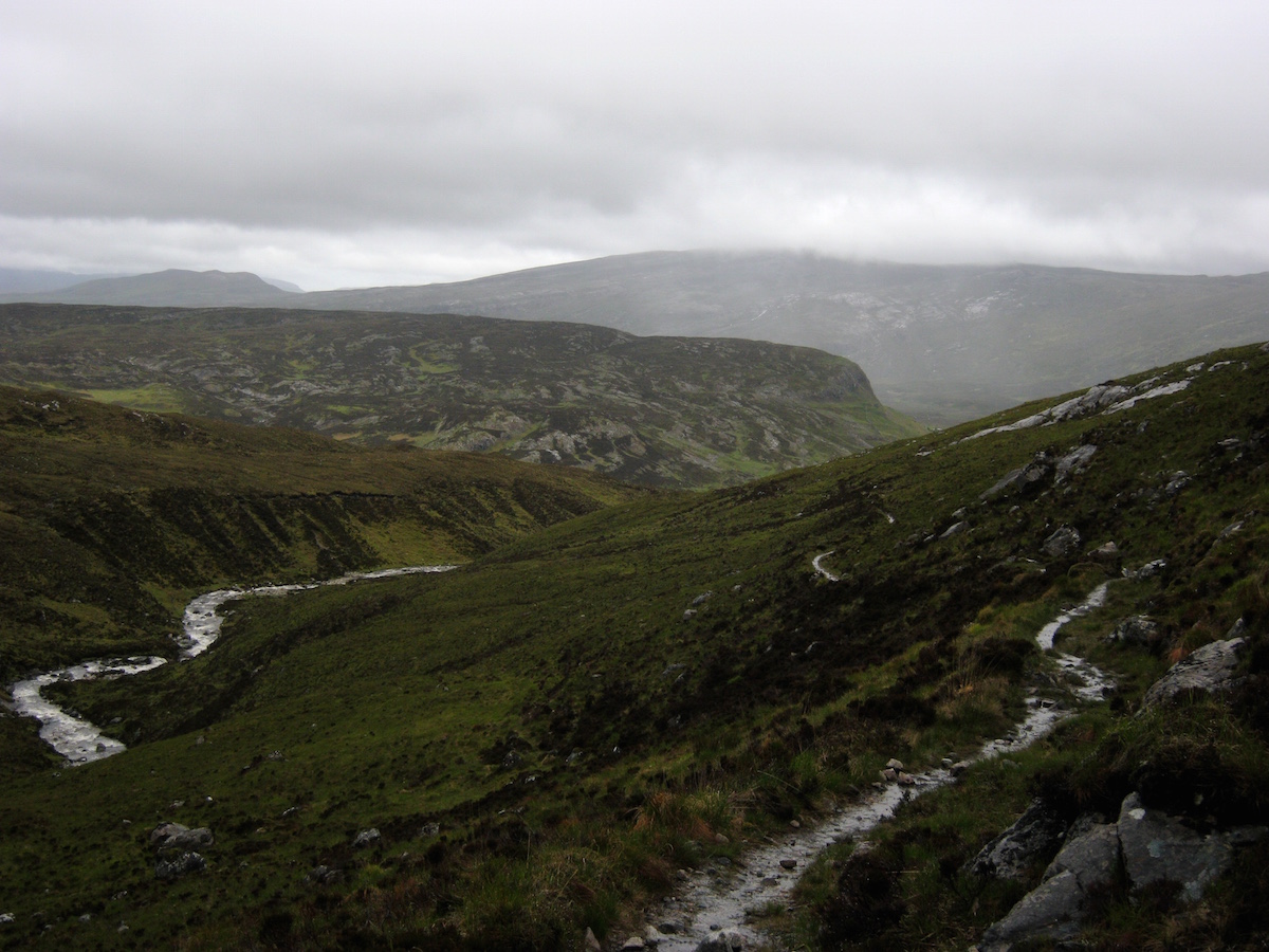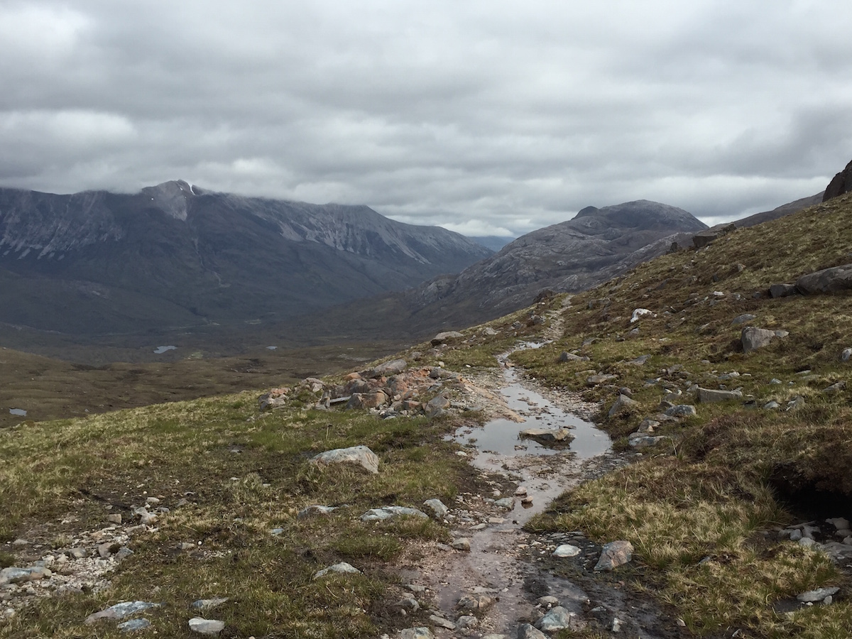 Despite the rainfall, the rivers weren't too bad in Glen Oykel although I did get pretty wet fording one of them; by this point in the trail I had given up on removing socks or rolling up trousers when wading rivers. The final climb to the bealach was steep, rough work, and by the time I reached the top of the pass I was absolutely soaked to the skin. My waterproof trousers had leaked badly and water had got under my jacket too. I was later to discover that about a litre of water had somehow penetrated my rucksack cover and pooled in the bottom of my pack. It was just one of those days when it's impossible to stay dry. And it was cold, too – at the top of the pass the rain briefly turned to wet snow.