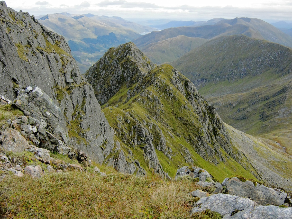 The Forcan Ridge of the SaddleJust beneath the summit of the pass, where the snow-dashed edge of the Forcan Ridge looks as formidable as any Alpine arete and the mountains of Kintail stretch out in a vista far beneath, I was obliged to cross the first and only patch of snow on the CWT. I imagine this patch must have been a bit more challenging four weeks previously, but on that day a few metres of careful step-kicking saw me past it easily enough.