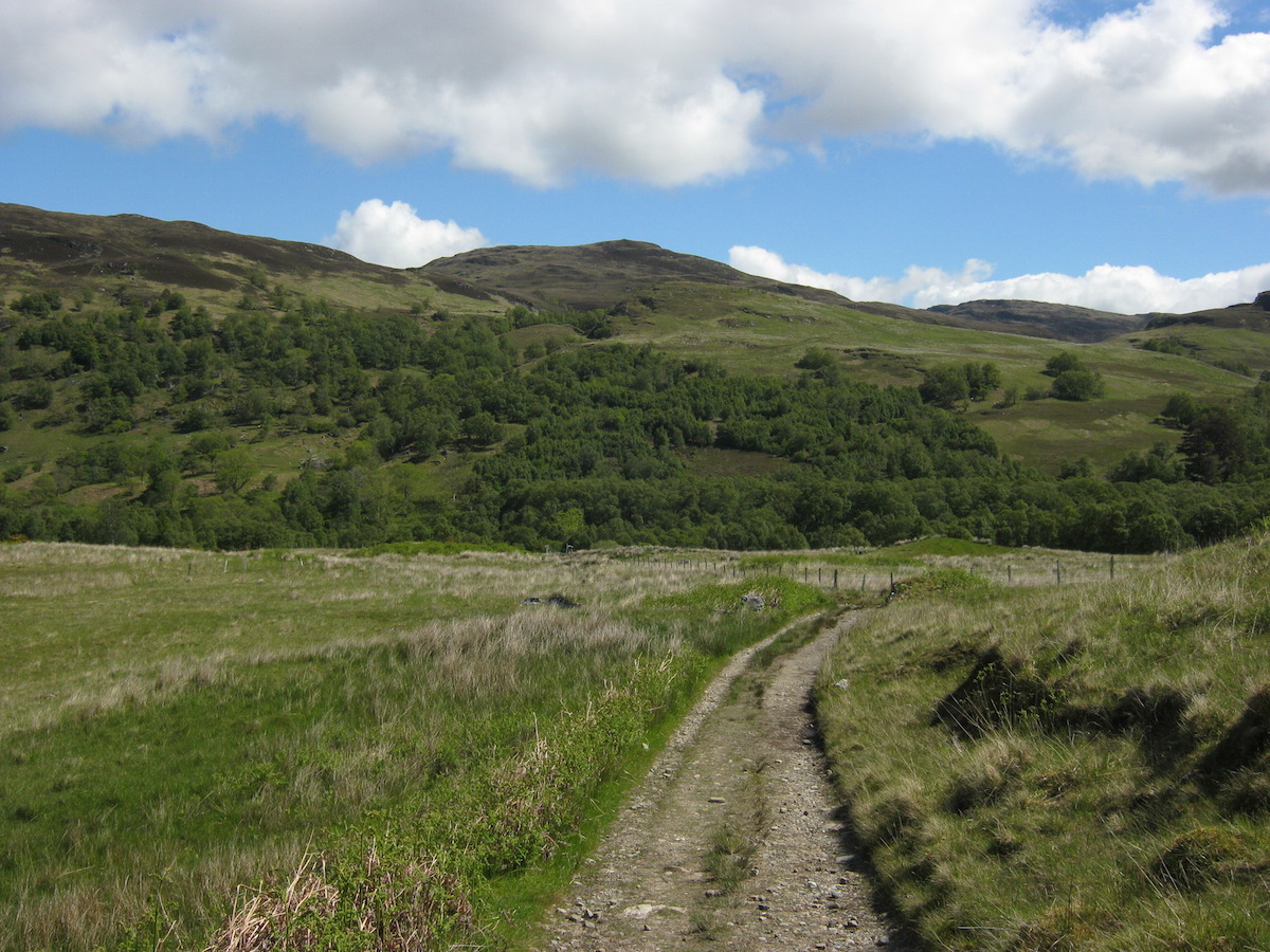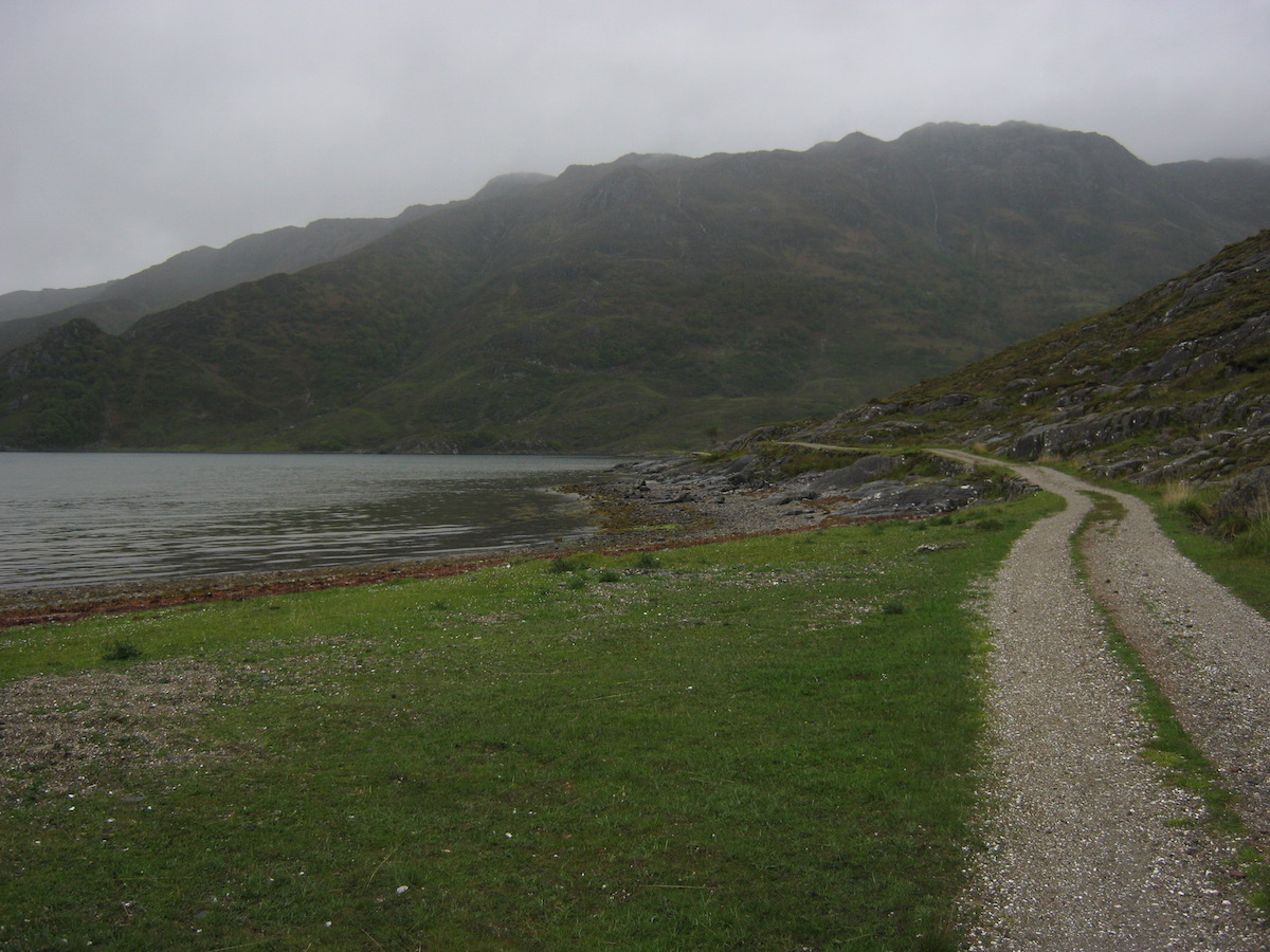 Easy walking on the first sectionAfter promising to meet Mark and Brian at Kinloch Hourn, I set off along the landrover track beside Barisdale Bay. It felt good to be hiking on a firm surface again but I couldn't help but feel that the track detracted from the wildness of the surroundings – something I had really appreciated since crossing over into Knoydart. The track petered out soon enough, though, and I found myself on an up-and-down path traversing rough hillsides to the south of Loch Hourn.