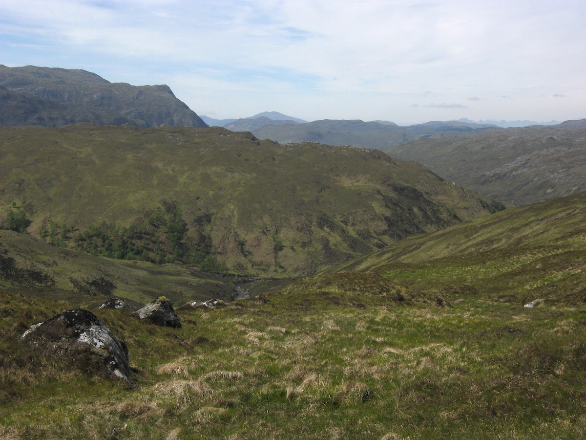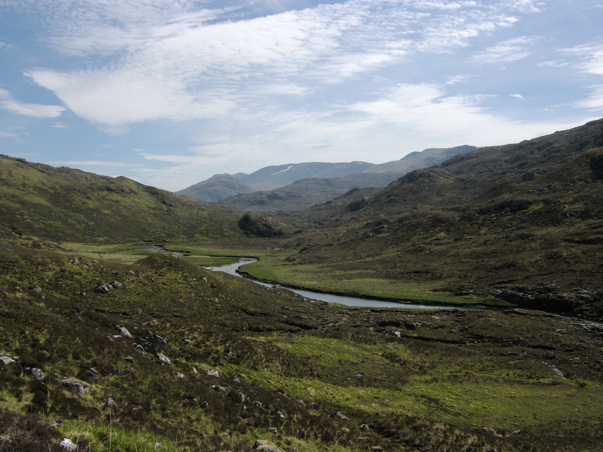 Looking back to Streap and the pass to GlenfinnanFortunately the rain eased off not long after I crossed the summit of the pass, and I noticed a reduction in the flow level of the river in a surprisingly short period of time.