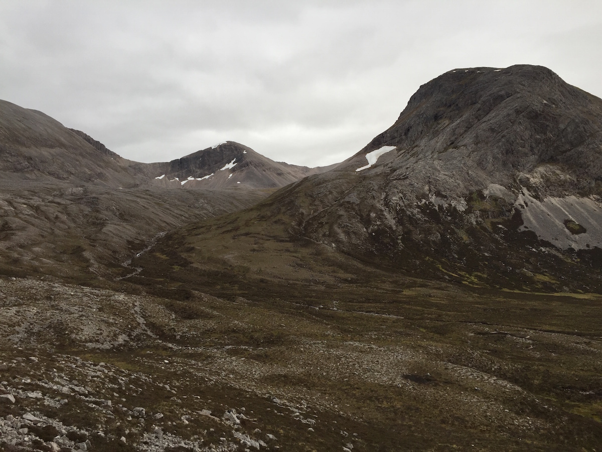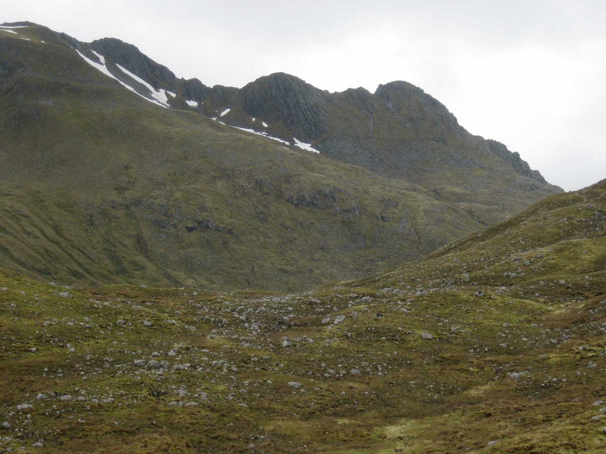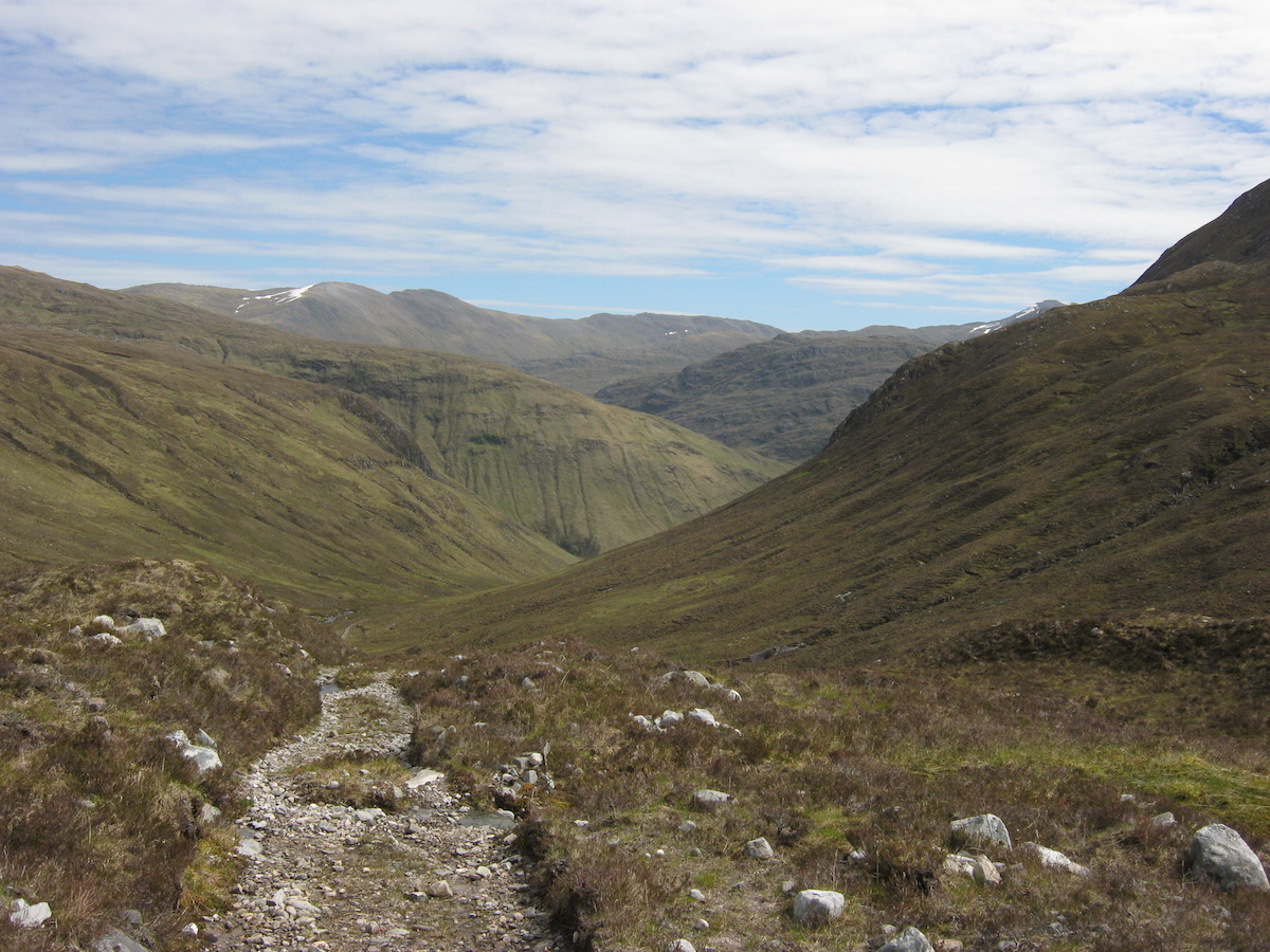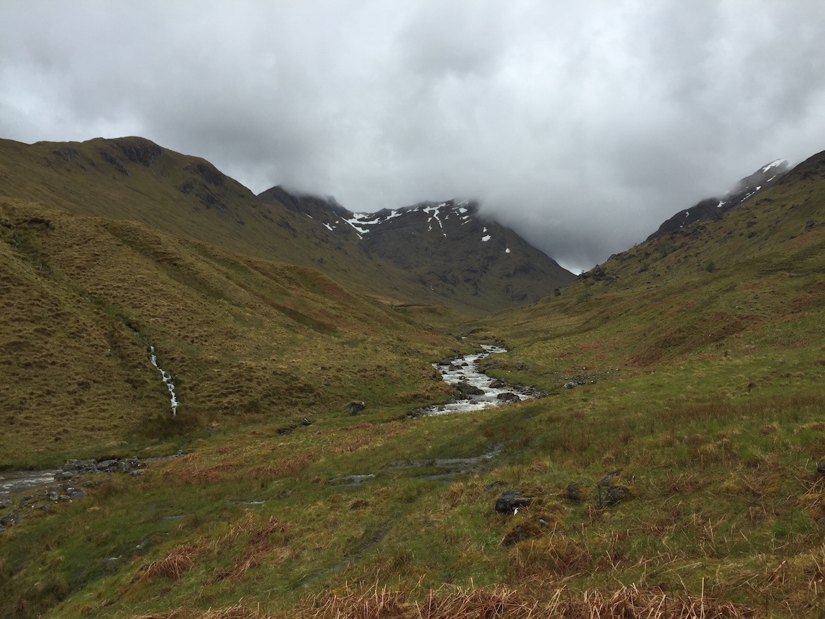 wildness a littleThe guidebook warned that this section involved some rough off-path navigation and a high pass – the highest, in fact, of the whole trail. Maybe it was because the weather was fine, or maybe I was starting to find my trail legs, but I found that day far easier than expected. The route followed good paths for some distance before a straightforward river crossing and then some off-path ascent in Coire Mhalagain. I passed beneath the huge snow patches of The Saddle. The terrain felt far more open than the complex crags of Knoydart and the walking was everywhere much, much easier.