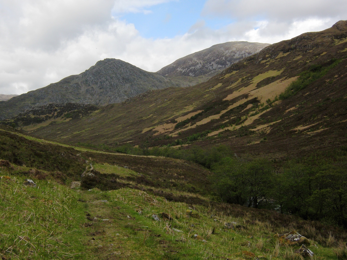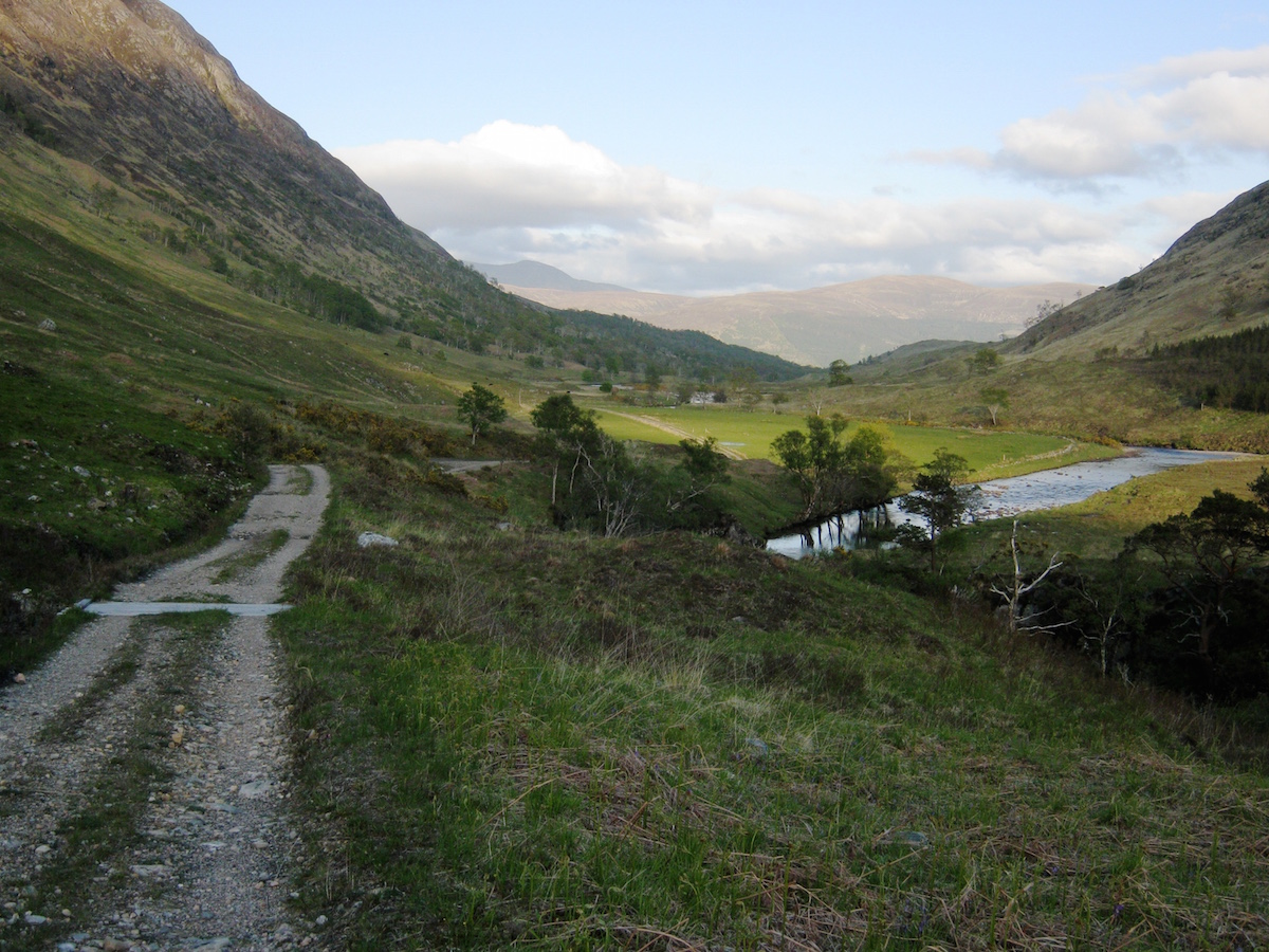 The mountains of Kintail A good path for the last mileThe descent to Shiel Bridge was initially trackless but gradually I picked up the traces of an old path. After a final easy river crossing, and the best path of the day for the last mile or so, I arrived in Shiel Bridge and set up my tent in the little campsite near the petrol station. Then I went to the pub and devoured an enormous quantity of fresh food.