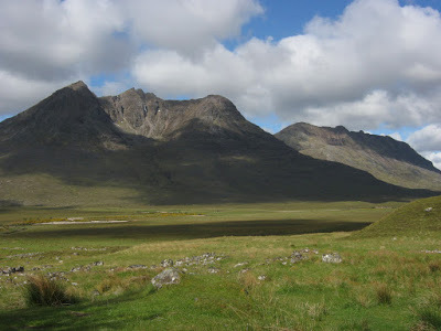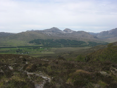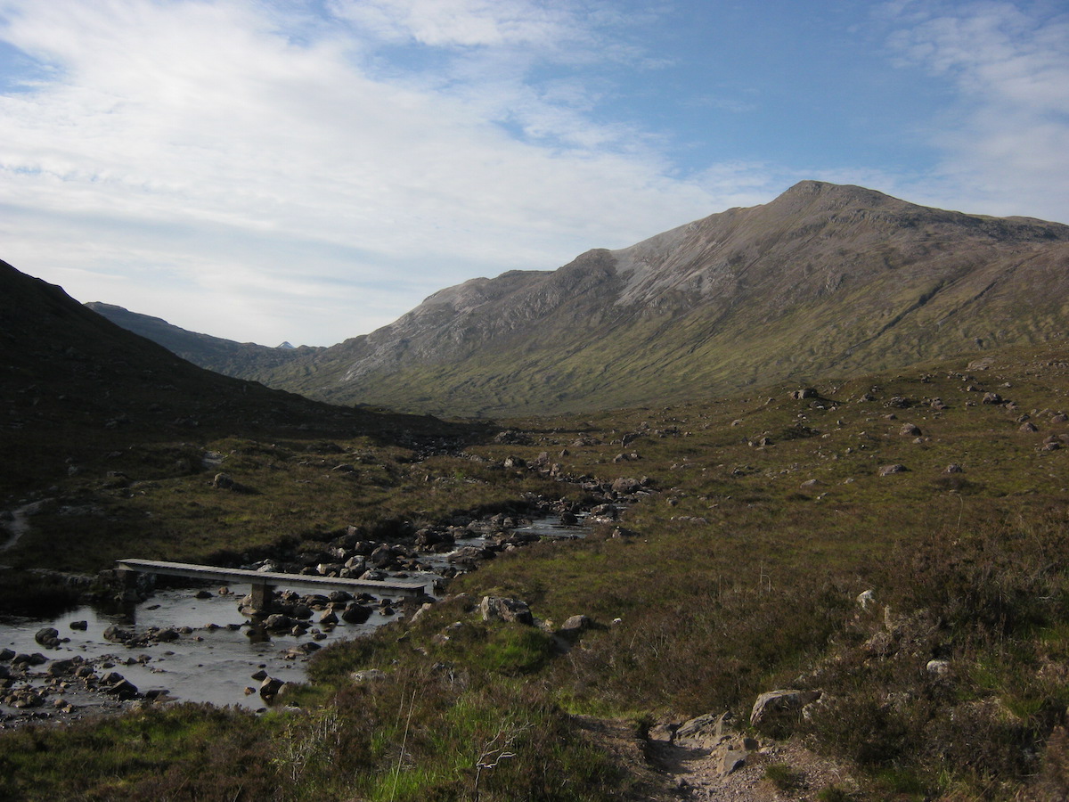 The path then aimed for the bealach between Sgurr na Forcan and Meallan Odhar where, a couple of years before, I'd stopped for breath before beginning the excellent scramble of the Forcan Ridge. The arete appeared foreshortened from that viewpoint but another excellent view of The Saddle presented itself from Meallan Odhar. I was very glad that the clouds had lifted and I could enjoy the feeling of striding amongst classic peaks. Too often in Knoydart I had been trapped in the grey mist, unable to see much at all beyond the bog in every direction.