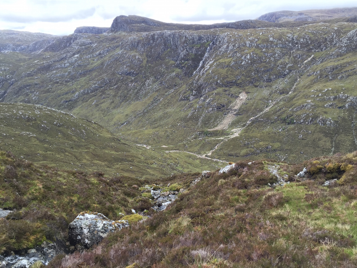The crossing of the River Traligill was the most difficult moment of the day. This is a serious watercourse and, in the conditions, I had to take some time to select the right crossing point. I ended up traversing the steep rocky sides of a ravine as I contemplated several possible places, each of which looked worse than the last. In the end it came down to jumping between two rocks spaced further apart than I'd have liked – the consequences of getting the leap wrong would have been catastrophic – but it was either that or risk wading a torrent that could easily have swept me away.