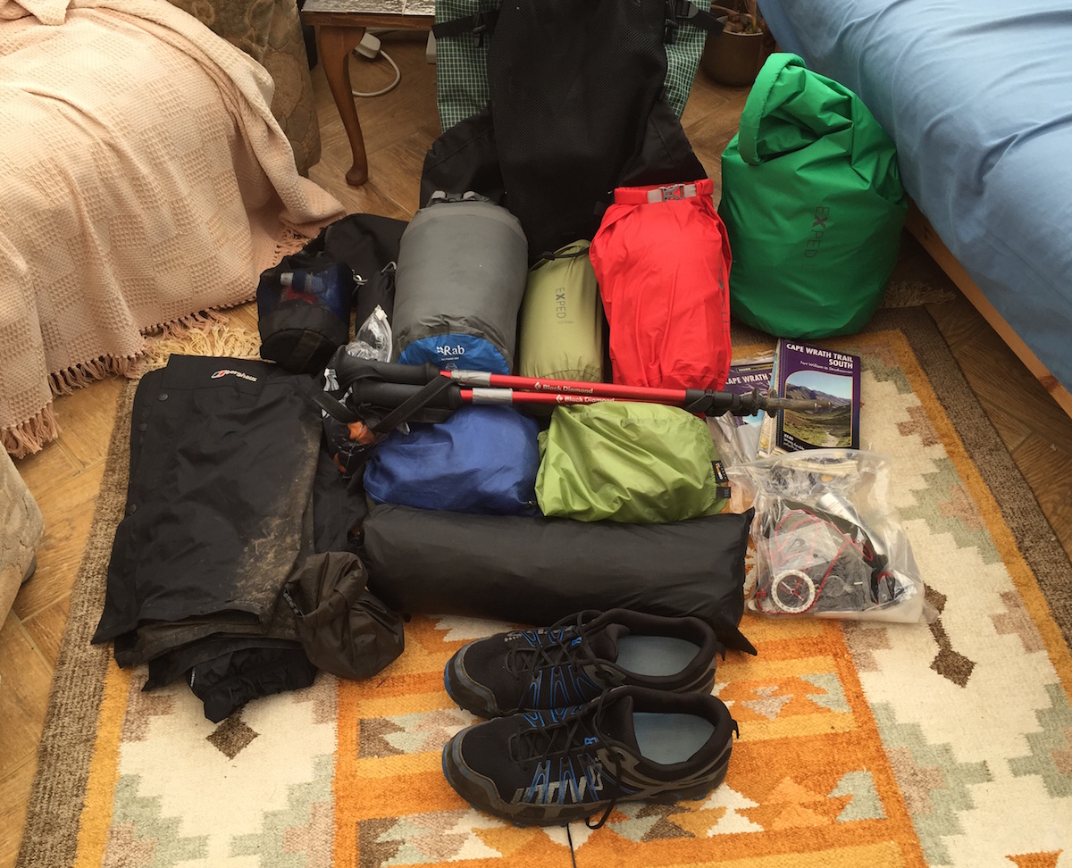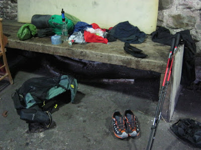 The sum of my worldly goods on the trail... Or, at least, that was the plan. My Goretex trail shoes failed to dry at all, even after hours sitting directly in front of the fire. I had not enjoyed the sensation of my feet sloshing around in buckets of water – which could have been avoided if I'd have hiked in my quick-draining Roclites – and resolved to keep the Scarpa Sparks for camp and bothy use only. My irrational fear of wet feet had led me to put the Goretex shoes on at the start of the day, but it's a tactic that has limited use in such conditions.