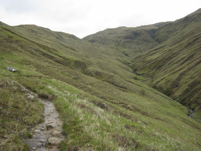 The upper Cona GlenI followed the landrover track until it petered out at NM 905 737. At this point I began the first climb of the trail, which happened to coincide with the first boggy section ... the first of many! It was raining by this point but I found the bad weather didn't bother me as much as it would normally do when hillwalking in Scotland. Despite the promising forecast for the month, I had prepared myself for the certainty of wet days. On a long walk you'll experience all kinds of weather.