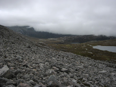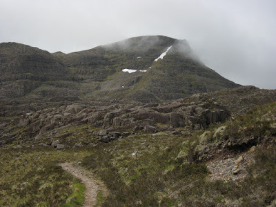 The descent from the bealach, picking its way down the western slopes of Conival, was even tougher than the ascent. Visibility was as poor as I'd ever seen it during the summer months on a mountain, and it was very easy to miss the faint path that wove a stealthy way between crumbling cliffs. Lose this path and you'll find yourself in extremely serious terrain. On one occasion I found myself looking down a 100m+ vertical drop, wondering where the hell the path had gone.
