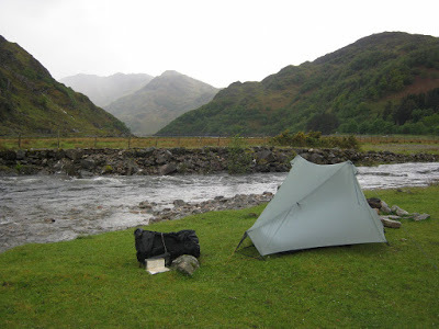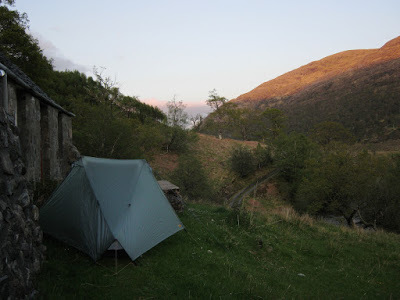 After phoning my partner Hannah at the public phone box (a much-needed contact with home, since I'd been out of signal reception for days) I pitched my tent at the field beside the river. The midges appeared almost as soon as the rain stopped. But the rain didn't return, and I took the opportunity to dry out my damp gear. By the time I went to sleep I was feeling very positive about the next stage of the trail ahead. I didn't, however, see Mark and Brian arrive, and in fact I never saw them again after our meeting at Barisdale bothy. I don't know whether they went on to complete the trail without catching up with me, or whether they ended up going home early.