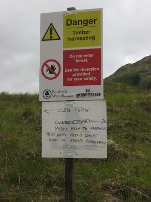Further rough terrain, but improving weather, took me to the enormous bog in the bottom of Glen Pean. The CWT was diverted at this point; instead of going into the forest, dire warnings on hand-made signs directed the hiker on a winding route nearer to the river. Apparently a DANGEROUS BOG! had already CLAIMED SEVERAL PEOPLE!! and subsequent signs warned against the consequences of ignoring the previous signs.