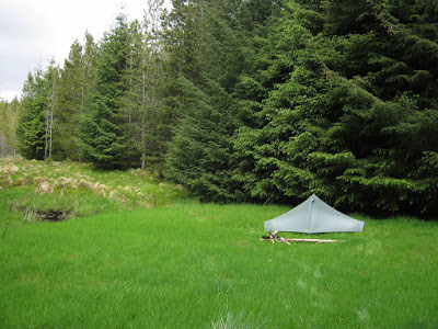 By this point the high wind was a serious cause of concern. I knew I had to find somewhere sheltered, so I spent some time in the forest off-trail looking for a suitable glade. Eventually I found just the spot: a grassy meadow in the curve of a burn, sheltered on all sides. It was actually a delightful campsite and the best wild camp of the entire trip. By the remains of a fire I could tell that others had camped there before.