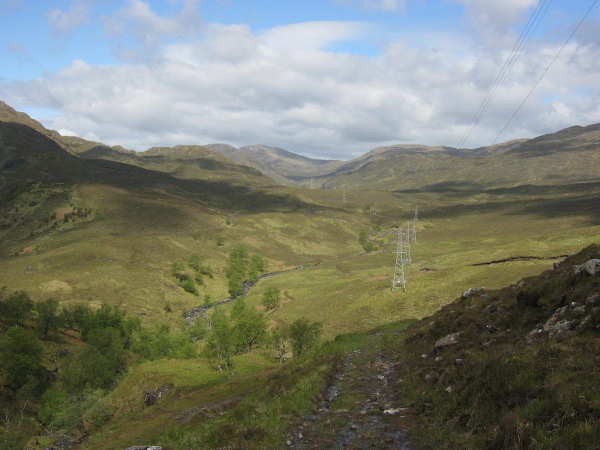 A pleasant section of the trail, but the pylons did spoil the illusion ofwildness a littleThe guidebook warned that this section involved some rough off-path navigation and a high pass – the highest, in fact, of the whole trail. Maybe it was because the weather was fine, or maybe I was starting to find my trail legs, but I found that day far easier than expected. The route followed good paths for some distance before a straightforward river crossing and then some off-path ascent in Coire Mhalagain. I passed beneath the huge snow patches of The Saddle. The terrain felt far more open than the complex crags of Knoydart and the walking was everywhere much, much easier.